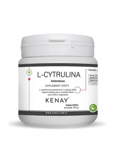 Kenay L-Cytrulina Suplement diety 300 g. Suplement. L-cytrulina jest prekursorem L-argininy, która odgrywa istotną rolę w produkcji tlenku azotu (NO) w organizmieL-cytrulina jest aminokwasem złożonym z trzech grup funkcyjnych: grupy aminowej (-NH2), grupy karboksylowej (-COOH) i łańcucha bocznego. . .