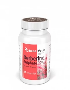 OPIS PRODUKTU: Suplement Diety - Bene Vobis® BERBERYNA to wysokiej jakości suplement diety w kapsułkach przeznaczony dla osób chcących uzupełnić swoją dietę w siarczan berberyny pozyskiwany z korzeni Berberis aristata znanego również jako berberys indyjski. Berberyna jest naturalnym alkaloidem, która wykazuje szereg korzyści prozdrowotnych: Berberyna może pomóc w utrzymaniu odpowiednich wartości trójglicerydów we krwi, co jest istotne dla prawidłowego funkcjonowania organizmu. Berberyna może przyczynić się do zachowania optymalnego poziomu cholesterolu we krwi, co jest ważne dla zdrowia układu krążenia.