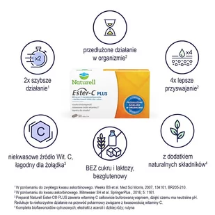 Ester-C PLUS suplement diety to połączenie witaminy C w opatentowanej formie Ester-C oraz składników naturalnie z nią występujących: ekstraktu z bioflawonoidów cytrusowych pomarańczy chińskiej, ekstraktu z aceroli, ekstraktu z dzikiej róży oraz rutyny z owoców sofory japońskiej.