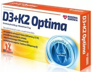 substancje wypełniające: celuloza mikrokrystaliczna, fosforan wapnia, cholekalcyferol (witamina D), substancje przeciwzbrylające: sole magnezowe kwasów tłuszczowych, dwutlenek krzemu1 kapsułka zawiera:Witamina D - 50 ug (1000% RWS)Witamina K (MK-7) - 75 ug (100% RWS)RWS - % referencyjnych wartości spożywczychMasa nettoZawartość opakowania: 30 kapsułekMasa netto: 9,30 gCharakterystykaWitaminy D i K mają korzystny wpływ na utrzymanie zdrowych kości. Jest to ważne szczególnie u osób w wieku dojrzałym. Produkt polecany jest wszystkim osobom, którezadbać chcą o sprawność ruchową i fizyczną oraz zdrowe i mocne kości.PrzeciwwskazaniaNadwrażliwość na którykolwiek związek preparatu.StosowanieZalecana porcja do spożycia w ciągu dnia: 1 kapsułka dziennie.PrzechowywanieProdukt przechowywać w temperaturze 15°C -25°C. Chronić przed światłem i wilgocią. Suplementy diety powinny być przechowywane w sposób niedostępny dla małych dzieci.