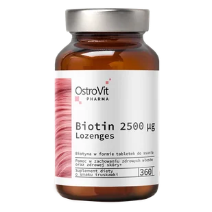 OstroVit Pharma Biotin 2500 µg lozenges to wysokiej jakości suplement diety w postaci tabletek do ssania o pysznym, truskawkowym smaku - opracowany dla wszystkich unikających suplementacji w postaci tabletek czy kropli do połykania. Nasz produkt stworzony został z myślą o wszystkich osobach dbających o piękny i zdrowy wygląd skóry i włosów, gdyż stanowi doskonałe uzupełnienie codziennej diety w biotynę. Linia OstroVit Pharma to suplementy wyróżniające się wysoką jakością składu, dla nawet najbardziej wymagających konsumentów, wiedzących co jest dla nich najważniejsze.
