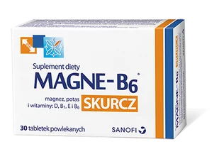 Suplement diety Magne-B6 Skurcz to kompozycja witamin i minerałów. Magnez wpływa na pracę mięśni i utrzymanie prawidłowego metabolizmu energetycznego. Wspomaga zachowanie równowagi elektrolitowej oraz przyczynia się do zmniejszenia uczucia zmęczenia i znużenia. Potas i witamina D przyczyniają się do prawidłowej pracy mięśni. Witamina B1 wpływa na właściwe funkcjonowanie serca. Witamina E pomaga w ochronie komórek przed stresem oksydacyjnym. Witamina B6 jest potrzebna do prawidłowego funkcjonowania układu nerwowego. Zastosowanie: preparat jest polecany osobom dorosłym, które chcą zadbać w diecie o odpowiedni poziom składników odżywczych odpowiedzialnych w naszym organizmie za prawidłowe funkcjonowanie mięśni i układu nerwowego. Zalecane spożycie: 3 tabletki dziennie. Nie należy przekraczać zalecanej porcji do spożycia w ciągu dnia. Składniki: magnez (cytrynian magnezu), potas (cytrynian potasu), substancje wypełniające (celuloza mikrokrystaliczna, poliwinylopolipirolidon, sól sodowa karboksymetylocelulozy usieciowana, hydroksypropyloceluloza), substancje glazurujące (hydroksypropylometyloceluloza, polidekstroza, talk), witamina E (octan DL-alfa-tokoferylu), substancje przeciwzbrylające (sole magnezowe kwasów tłuszczowych, dwutlenek krzemu), barwnik (dwutlenek tytanu), witamina D (cholekalcyferol), witamina B6 (chlorowodorek pirydoksyny), witamina B1 (monoazotan tiaminy). 3 tabletki zawierają: 300mg potasu (15%)*, 150mg magnezu (40%)*, 12mg witaminy E (100%)*; 1,4mg witaminy B6 (100%)*; 1,1mg witaminy B1 (100%)*, 5mcg witaminy D (100%)*. *RWS - Referencyjna Wartość Spożycia. Ważne wskazówki: Nie należy przekraczać zalecanej dziennej porcji. Zrównoważony sposób żywienia i prawidłowy tryb życia jest ważny dla funkcjonowania organizmu człowieka. Suplement diety nie może być stosowany jak substytut (zamiennik) zróżnicowanej diety. Suplement diety powinien być przechowywany w sposób niedostępny dla małych dzieci. Preparat należy przechowywać w temperaturze pokojowej (15-25 stopni Celsjusza), w suchym miejscu. Kobiety w ciąży powinny skonsultować się z lekarzem przed zastosowaniem suplementu. Podmiot odpowiedzialny: Sanofi-Aventis Sp. z o.o. ul.