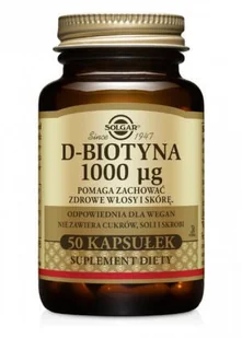 Solgar D-Biotyna 1000 ug Kapsułki 50 utrzymanie prawidłowego metabolizmu wspomaga układ nerwowy dla wegan i wegetarian 1 kapsułka dziennie Bezglutenowy, Bezmleczny, Koszerny, Wegański, Wegetariański Biotyna należy do witamin z grupy B i swoją popularność zawdzięcza niepodważalnym korzyściom dla urody. Udowodniono bowiem, że pomaga zachować zdrową skórę i włosy. Biotyna występuje m. in. w wątrobie, orzechach włoskich i ziemnych, mące sojowej, żółtku jaj, krabach, migdałach, sardynkach, grzybach, brązowym ryżu, mące pełnoziarnistej, szpinaku, marchwi, pomidorach. Przyjmując jedną kapsułkę dziennie możesz wzbogacić swoją codzienną dietę o składnik, który: