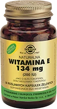 OPIS Witamina E D-alfa tokoferol oraz mieszanka tokoferoli 134mg 200IU 50 kapsułek Solgar - silne działanie antyoksydacyjne- ochrania komórki- bierze udział w przekazywaniu sygnałów nerwowych- zabezpiecza wielonienasycone kwasy przed utlenianiem Witamina E jest silnym antyutleniaczem, chroni przed stresem oksydacyjnym i ochrania komórki. Dodatkowo wspomaga usuwanie wolnych rodników. Uczestniczy w ochronie krwinek czerwonych, ekspresji genów i przekazywaniu sygnałów nerwowych. Korzystnie wpływa na prawidłową wydolność mięśni. Z tego powodu jest zwana "witaminą młodości".