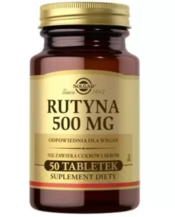 Opis: Preparat Solgar posiada 500 mg naturalnej rutyny w tabletce. Rutyna zaliczana jest do grupy drugorzędowych bioflawonoidów (aktywnych biologicznie, biodostępnych flawonoidów). W każdej tabletce znajduje się rutyna zwana przez farmaceutów jako kwercetyno-3-rutozydem lub nieco prościej – naturalnie występującym glikozydem bioflawonoidu kwercetyny (kwercetyna z dołączoną cząstką glukozy). W preparacie Rutyny 500 mg Solgar wykorzystuje wyłącznie rutynę pochodzącą ze strączków nasion brazylijskiego krzewu Fava d’ Anta (Dimorphandra mollis). . Skład: Jedna tabletka zawiera 500 mg Rutyny, Naturalne substancje pomocnicze: