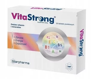 Właściwości-Witaminy B1, B2, B3, C i biotyna pomagają w prawidłowym funkcjonowaniu układu nerwowego.-Selen, żelazo, cynk, witaminy A, C, B12 i B6 pomagają w prawidłowym funkcjonowaniu układu odpornościowego.-Magnez, żelazo, witaminy B2, B3, B6, B12 i C przyczyniają się do zmniejszenia uczucia zmęczenia i znużenia.-Selen, cynk, witaminy B2, E i C pomagają w ochronie komórek przed stresem oksydacyjnym.-Biotyna, cynk i selen pomagają zachować zdrowe włosy.-Magnez i cynk pomagają utrzymać zdrowe kości.-Witaminy C, B6, B12, B3, B2 i B1, biotyna,jod oraz magnez przyczyniają się do utrzymania prawidłowego metabolizmu energetycznego.Działanie:Pozytywnie wpływa na zwiększenie odporności. Poprawia kondycję organizmu.Sposób użycia: spożywać 1 tabletkę dziennie, popijając wodą. Nie należy przekraczać zalecanej dziennej porcji, tj. 1 tabletki w ciągu dnia.Składniki aktywne: Witamina E(ekwiwalent alfa-tokoferolu) (6 mg alpha-TE) 50%RWS*, tiamina (witamina B1) (0,7 mg) 64%RWS*, ryboflawina (witamina B2) (0,9 mg) 64%RWS*, witamina B6 (0,85 mg) 61%RWS*, witamina B3 (Nicyna) (8,8 mg) 55%RWS*, kwas foliowy (220 ug) 110%RWS*, kwas pantotenowy (witamina B5) (6 mg ) 100%RWS*, biotyna(D-biotyna) (30 ug) 60%RWS*, witamina B12 (1,3 ug) 52%RWS*, witamina C (48 mg) 60%RWS*, magnez (60 mg) 16%RWS*, cynk (9,4 mg) 94%RWS*, żelazo (12 mg) 86%RWS*, selen (48 ug) 87%RWS*, witamina A(ekwiwalent retinolu) (500 ug) 63%RWS* , jod (150 ug) 100%RWS*.