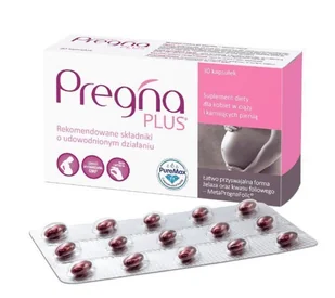 Pregna PLUS to nowoczesny suplement diety dla kobiet w ciąży i mam karmiących piersią w formie nutraceutyka, opracowany według standardów Evidence Based Medicine. Zawiera starannie dobrany zestaw najważniejszych i rekomendowanych dla kobiet w ciąży składników o udowodnionej skuteczności, w ilościach zalecanych przez Ekspertów Ginekologii i Położnictwa: kwas foliowy, żelazo, witaminę D3, jod i DHA. Składniki suplementu diety Pregna PLUS pełnią wiele istotnych funkcji w organizmie, które w sposób fizjologiczny wpływają na prawidłowy przebieg ciąży. Uzupełniające spożycie kwasu foliowego zwiększa poziom folianów u matki. Niski poziom folianów u matki jest czynnikiem ryzyka rozwoju wad cewy nerwowej u rozwijającego się płodu. Żelazo bierze udział w procesie podziału komórek oraz pomaga w produkcji czerwonych krwinek. Dodatkowo żelazo i kwas foliowy w sposób korzystny wpływają na funkcjonowanie układu odpornościowego przyszłej mamy. Witamina D3 pomaga w prawidłowym wykorzystywaniu wapnia i fosforu przez organizm kobiety. Dostarczanie organizmowi odpowiednich ilości wielonienasyconych kwasów tłuszczowych z rodziny omega-3 jest bardzo ważne i zalecane przez Ekspertów w trakcie ciąży i w okresie karmienia piersią, szczególnie istotny jest kwas dokozaheksaenowy DHA. Do czasu porodu dziecko pobiera niezbędne ilości DHA z organizmu matki, po porodzie nowo narodzone dziecko otrzymuje je wraz z jej pokarmem. Zastosowanie: suplementacja diety w składniki preparatu dla kobiet w ciąży i karmiacych piersią. Zalecane spożycie: zalecana dzienna porcja: 1 kapsułka dziennie. Składniki: olej rybi zawierający min 60% kwasów omega-3 (olej rybi, przeciwutleniacz - mieszanina tokoferoli), żelatyna, siarczan żelaza (II), substancja utrzymująca wilgoć - glicerol, tlenek cynku, substancja zagęszczająca - wosk pszczeli żółty, emulgator - lecytyna sojowa, witamina B12 (maltodekstryna, cyjanokobalamina), barwnik - dwutlenek tytanu, witamina B6 (chlorowodorek pirydoksyny), witamina D3 (olej roślinny MCT, cholekalcyferol), emulgator - dwutlenek krzemu, kwas foliowy (kwas pteroilomonoglutaminowy), jodan potasu, barwnik - czerwony tlenek żelaza; Stary skład: 1 kapsułka zawiera: kwas foliowy 400mcg, żelazo 26mg, witamina D3 1500IU (37,5mcg), jod 150mcg, olej rybi (min. 60% zawartości kwasów omega-3) 110mg, EPA 33mg, DHA 22mg, cynk 10mg, witamina B6 1,4mg, witamina B12 2,5mcg. Nowy skład: 1 kapsułka zawiera: kwas foliowy 400ug (200%)*, żelazo 26mg (186%)*, witamina D3 2000IU(50ug) (1000%)*, jod 200ug (133%)*, olej rybi: min. 60% zawartości kwasów omega-3 100mg (w tym: EPA 30mg, DHA 20mg). * RWS - Referencyjna Wartość Spożycia. Ważne wskazówki: Nie należy przekraczać zalecanej dziennej porcji. Zrównoważony sposób żywienia i prawidłowy tryb życia jest ważny dla funkcjonowania organizmu człowieka. Suplement diety nie może być stosowany jak substytut(zamiennik) zróżnicowanej diety. Suplementy diety powinny być przechowywane w sposób niedostępny dla małych dzieci, w temperaturze pokojowej i w suchym miejscu. Wyprodukowano w UE dla: Verco S.A. Ul. Odrowąża 15, 03- 310 Warszawa Zmiana składu produktu.