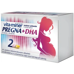 Produkt Vita-miner Pregna + DHA, 30 tabletek + 30 kapsułek do kupienia w Gemini. Vita-Miner Pregna to suplement diety stworzony z myślą o kobietach w 2 i 3 trymestrze ciąży i karmiących piersią. Multiwitamina to połączenie ...