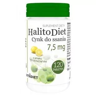 Vitadiet HalitoDiet Cynk do ssania 7,5 mg 120 tabletek HalitoDiet. Cynk do ssania 7,5 mg o smaku cytrynowym – suplement diety wspomagający prawidłowe funkcjonowanie układu odpornościowego. Cynk: przyczynia się do prawidłowego funkcjonowania układu odpornościowego pomaga zachować: zdrowe włosy, skórę i paznokcie pomaga w utrzymaniu prawidłowej płodności i prawidłowych funkcji rozrodczych Zawiera substancję słodzącą. Zawiera aspartam (źródło fenyloalaniny).