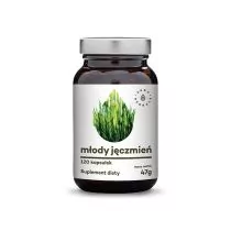 OPIS Młody zielony jęczmień sproszkowane liście 120 kapsułek AURA HERBALS - źródło chlorofilu- działanie antyoksydacyjne- zawiera błonnik i aminokwasy- działa oczyszczająco i pobudzająco- pozytywnie wpływa na procesy metaboliczne Młody jęczmień zawiera witaminy, minerały, aminokwasy oraz chlorofil. Odżywia i pobudza organizm na długi czas. To skoncentrowane źródło białka oraz błonnika wspomagającego pracę jelit i wpływającego na procesy metaboliczne. Zawarta w jego składzie witamina C oraz E maja silne działanie antyoksydacyjne. Wspomagają one organizm w usuwaniu wolnych rodników, ochraniają komórki a co za tym idzie wspierają pracę układu odpornościowego i mogą hamować procesy starzenia się organizmu.