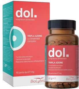 BioLybra Dol. 90 kapsułek BioLybra DOL to suplement diety oparty na KOMPLEKSIE TERPENDOLOWYM, czystych terpenach i wyciągu z imbiru, przydatny do poprawy funkcji stawów i walki z miejscowymi stanami napięcia. BioLybra DOL dzięki zawartości oleju z nasion KONOPI, Witamin A, E, B12 stanowi codzienne wsparcie dobrego samopoczucia stawów, równowagi fizycznej i psychicznej w walce ze stanami zmęczenia i znużenia, często występującymi w przypadku obniżonej funkcji stawów i zlokalizowane napięcie mięśni. Składniki: Hemp (Cannabis Sativa L.) seed oil, vegetable soft capsule (corn starch, glycerin, carrageenan, water; dyes: titanium dioxide E171, iron oxide E172), beta caryophyllene flavor, ginger (Zingiber officinale Rose.) Rhizome extract dry tit. 22% in gingerols and shogaols, mono and diglycerides of fatty acids (E471), polyglyceryloleate (E475), myrcene flavor, vitamin E (D-alpha tocopherol), vitamin A (retinylpalmitate 1 MIU / g), vitamin B12 ( cyanocobalamin 0.1%), sunflower lecithin (E322).