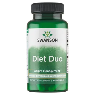 Swanson Diet Duo Chitosan & White Kidney Bean Kapsułki, 60 szt. Swanson Diet Duo to suplement diety zawierający opatentowane składniki: Phase 2 Carb Controller® (ekstrakt z białej fasoli) oraz LipoSan ULTRA® Chitosan (chitozan pochodzenia naturalnego, pozyskiwany ze skorupiaków). Oba składniki stanowią wsparcie dla osób dbających o zrównoważoną masę ciała i świadome nawyki żywieniowe. Formuła została opracowana z myślą o uzupełnieniu diety osób aktywnych fizycznie oraz tych, którzy chcą lepiej kon