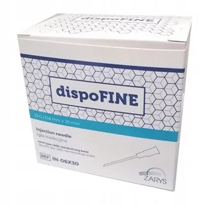 Igły iniekcyjne DispoFine rozmiar: 0,6 mm x 30 mm ilość: 100 sztuk Wyrób przeznaczony do iniekcji dożylnych, iniekcji domięśniowych, iniekcji podskórnych Właściwości osłonka i nasadka wykonana z polipropylenu; cienkie ścianki zapewniają właściwe tempo strumienia; końcówka igły ostrzona w trzech płaszczyznach; niska siła wkłucia i przesuwu; powierzchnia rurek pokryta środkiem poślizgowym (silikon); klejone elementy igły zapobiegające oddzieleniu; nasadki barwione zgodnie z kodem ISO ułatwiające szybkie rozpoznanie rozmiaru igły; opakowanie typu blister-pack; opakowanie podstawowe - 100szt; nietoksyczne, niepirogenne; sterylizowane tlenkiem etylenu;
