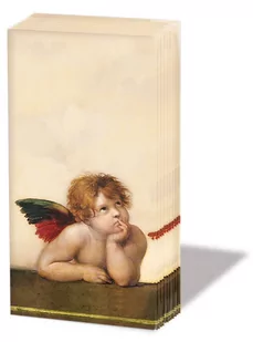 Ambiente, chusteczki do nosa 10szt. , Angelo (21,5x22cm) Papierowe chusteczki do nosa o motywie "Angelo" w opakowaniu zawierającym dziesięć sztuk o tradycyjnej wielkości, tzn. = około 21,5x22cm Motyw drukowany na fleksograficznych prasach drukarskich tuszami bezpiecznymi dla żywności i skóry człowieka, posiadającymi certyfikatem FSC, które też zapewniają bardzo dużą dokładność oraz jakość druku. Połączenie porcelany i serwetek(i innych elementów o tym motywie) daje niesamowity, oryginalny i niepowtarzalny efekt dekoracji stołu przy którym aż chce się spożywać posiłek lub. . . posiedzieć ;-) Ambiente to holenderska firma powstała ponad ćwierć wieku temu projektująca i tworząca swoje produkty stołowe o najwyższej jakości w fabryce w południowo-wschodniej Holandii, niedaleko granicy z Niemcami.