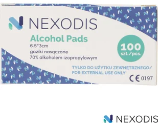 Każdy gazik jest złożony na pół i nasączony alkoholem izopropylowym o stężeniu 70%. Gazik nasączony alkoholem Nexodis jest wyrobem medycznym klasy I. Przeznaczony tylko do użytku zewnętrznego. Gazik nasączony alkoholem NEXODIS stosuje się przecierając starannie powierzchnię skóry, najlepiej ruchem okrężnym od miejsca planowanego wkłucia do zewnątrz. Zawartość 70% alkoholu w gazie wpływa korzystnie na usuwanie wirusów i bakterii ze skóry.