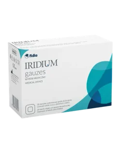 Opis: Iridium Gauzes Iridium Gauzes to wyrób medyczny w postaci sterylnych, jednorazowych gazików. Preparat przeznaczony do stosowania wspomagająco podczas leczenia schorzeń okolic oczu. Gaziki pozwalają na usuwanie z okolic powiek zalegających strupów i wydzielin z oka, które mogą być spowodowane toczącymi się stanami zapalnymi lub zakażeniami. Zaleca się również jego stosowanie w połączeniu z określonym leczeniem w przypadku: alergicznych chorób oczu, stanów zapalnych lub zakażeń oczu.