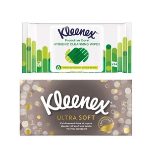 Chusteczki higieniczne KLEENEX Ultra Soft 64 szt+ Wet Wipes 24 Zestaw składa się z: 1x Chusteczki nawilżane KLEENEX antybakteryjne 24 szt 1x Chusteczki higieniczne KLEENEX Ultra Soft 64 szt Chusteczki nawilżane KLEENEX antybakteryjne 24 szt produkt impregnowany łagodnym balsamem o neutralnym pH bezalkoholowy przebadany przez dermatologów i pediatrów odpowiedni dla dorosłych i dzieci od 3 roku życia Dzięki specjalnej formule zawartej w składzie, nawilżane chusteczki higieniczne Kleenex zabijają 99,9% drobnoustrojów i wirusów, w tym Escherichia coli, Staphylococcus aureus, H1N1 i H5N1. Składnik aktywny: chlorek benzalkoniowy 0,1%. Chusteczki higieniczne KLEENEX Ultra Soft 64 szt Cechy produktu: