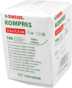 Kompresy niejałowe z gazy Kompres (13N 8W) (Batist) Kompresy z gazy wyprodukowane przez firmę Batist należą do niesterylnych materiałów opatrunkowych. Zostały wytworzone ze 100% bawełny i są materiałem jednorazowego użytku. Zastosowanie niesterylnych kompresów jest szerokie u bardzo uniwersalne. Materiały opatrunkowe są podstawą funkcjonowania wszystkich obszarów medycyny. Są potrzebne także w każdej apteczce domowej i w zakładach pracy.
