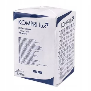 Kompresy z gazy bez nitki RTG niejałowe Kompri Lux 7,5x7,5 cm 100 szt Kompri Lux to wysokiej jakości kompresy niejałowe wykonane z miękkiej bawełny. Materiał ten wykazuje wysoką hydrofilowości, czyli zdolność łączenia się z wodą. Dzięki temu niejałowe kompresy z gazy szybko chłoną płyny. Zostały wybielone za pomocą wody utlenionej, bez użycia chloru, dlatego są bezpieczne dla pacjentów i można ich używać bezpośrednio na otwarte rany. Podwinięte brzegi produktów chronią przed wystającymi, luźnymi nitkami.