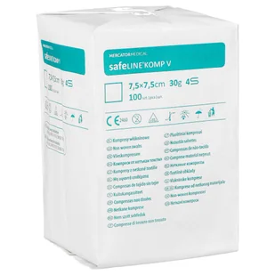 Kompresy z gazy Safeline Komp 30G 4W Kompresy z gazy Safeline Komp to znakomitej jakości sterylne materiały opatrunkowe wyprodukowane ze 100% bawełny. Są gotowe użycia. Dzięki zastosowaniu do produkcji kompresów bawełny materiały opatrunkowe Safeline Komp wyróżniają się wysokimi właściwościami absorpcyjnymi. Kompresy z gazy cechują się czystością chemiczną i mikrobiologiczną. Kompresy sterylne z gazy zostały poddane bieleniu bez użycia chloru.