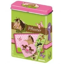 20 plastrów koni w ładnie wydrukowanym blaszanym pudełku. Do stosowania na zadrapania, skaleczenia, otarcia, pocałunki koni i inne drobne urazy. Elastyczny i przepuszczalny dla powietrza