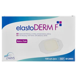 Opatrunek foliowy z ramką elastoDERM F (Zarys) Opatrunek foliowy z ramką elastoDERM F to wysokiej jakości opatrunek bez wkładu chłonnego. Opatrunek ma wymiary 6 cm x 7 cm. Jest samoprzylepny oraz sterylny. Opatrunek stanowi mocowanie zabezpieczające dożylne kaniule. ElastoDERM F jest opatrunkiem wtórnym.