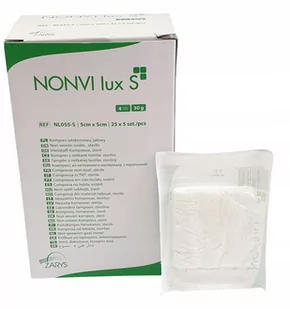 Kompresy włókninowe jałowe 5 cm x 5 cm NONVI lux S Zarys - opakowanie 125 szt. NONVI lux S 5 x 5 cm to kompresy z miękkiej włókniny, sterylne. Pakowane w papierowo foliowe saszetki po 5 szt w każdej (25 saszetek w kartonie). W opakowaniu kartonowym znajduje się 125 sztuk kompresów. Właściwości kompresów NONVI lux S, Zarys: