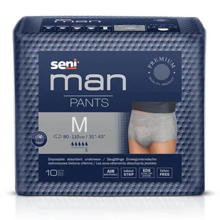 Bielizna chłonna Seni Man Pants M 10 szt. Seni Man Pants to bielizna chłonna dla mężczyzn, którzy prowadzą aktywny tryb życia i chcą czuć się sucho i bezpiecznie w różnych sytuacjach mimo lekkiego lub średniego nietrzymania moczu. Dopasowane do męskiej anatomii, co zapewnia komfort i swobodę ruchów. W szarym kolorze, który dobrze komponuje się z męską garderobą. To rozwiązanie idealne dla mężczyzn z lekkim i średnim nietrzymaniem moczu, którzy: