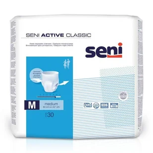 Majtki chłonne Seni Active Classic M 30 szt. Jednorazowe majtki chłonne Seni Active Classic (chłonność 5,5/7 kropelek) to idealne rozwiązanie dla osób ze średnim nietrzymaniem moczu. Majtki chłonne Seni Active Classic polecane są osobom, które potrzebują pewniejszego zabezpieczenia niż wkładki urologiczne. Łatwość użycia – majtki chłonne zakłada się tak samo jak zwykłą bieliznę. Aby zdjąć zużyty wyrób wystarczy rozerwać boczne szwy, a specjalna taśma ułatwi dyskretne i higieniczne wyrzucenie go.