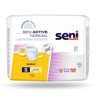 Majtki chłonne SENI Active Normal Small 10 szt. Opis: Jednorazowe majtki chłonne Seni Active Normal (chłonność 5,5/7 kropelek) to idealne rozwiązanie dla osób ze średnim nietrzymaniem moczu. To pierwszy z trzech poziomów chłonności majtek chłonnych Seni Active. Majtki chłonne Seni Active Normal polecane są osobom, które potrzebują pewniejszego zabezpieczenia niż wkładki urologiczne. Łatwość użycia – majtki chłonne zakłada się tak samo jak zwykłą bieliznę.