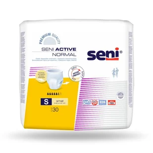 Majtki chłonne SENI Active Normal Small 30 szt. Opis: Jednorazowe majtki chłonne Seni Active Normal (chłonność 5,5/7 kropelek) to idealne rozwiązanie dla osób ze średnim nietrzymaniem moczu. To pierwszy z trzech poziomów chłonności majtek chłonnych Seni Active. Majtki chłonne Seni Active Normal polecane są osobom, które potrzebują pewniejszego zabezpieczenia niż wkładki urologiczne. Łatwość użycia – majtki chłonne zakłada się tak samo jak zwykłą bieliznę.
