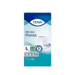 Cechy i korzyści: • Błyskawiczna suchość dzięki systemowi FeelDry • Ochrona przed nieprzyjemnym zapachem dzięki systemowi Odour Neutralizer • Zakładane jak zwykła bielizna • Dyskrecja i komfort w trakcie noszenia • Oddychający materiał dla ochrony skóry Dowiedz się więcej: TENA Pants Super dostępne są również w rozmiarze M oraz w wariantach o niższych poziomach chłonności: TENA Normal i TENA Plus.