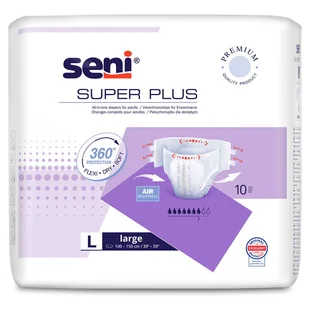Pieluchomajtki Super SENI PLUS 3 Large 10szt. Opis: Super Seni Plus (chłonność 7/9 kropelek) to oddychające pieluchomajtki dla dorosłych zapinane na rzepy. To drugi z czterech poziomów chłonności, tzw. chłonność dzienna, rekomendowana przy nasilonym nietrzymaniu moczu. Pieluchomajtki Super Seni Plus przeznaczone są dla osób ze średnim i ciężkim nietrzymaniem moczu o ograniczonej mobilności (na stałe pozostających w łóżku lub poruszających się przy wsparciu opiekuna).