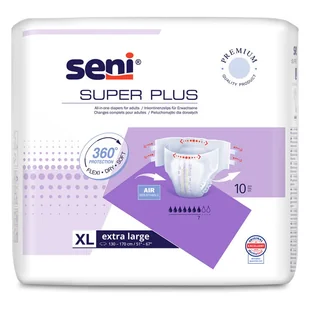 Pieluchomajtki Super SENI PLUS 4 XL 10szt. Opis: Super Seni Plus (chłonność 7/9 kropelek) to oddychające pieluchomajtki dla dorosłych zapinane na rzepy. To drugi z czterech poziomów chłonności, tzw. chłonność dzienna, rekomendowana przy nasilonym nietrzymaniu moczu. Pieluchomajtki Super Seni Plus przeznaczone są dla osób ze średnim i ciężkim nietrzymaniem moczu o ograniczonej mobilności (na stałe pozostających w łóżku lub poruszających się przy wsparciu opiekuna).