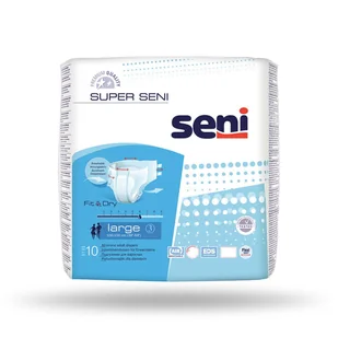 Pieluchomajtki Super SENI rozmiar 3 Large 10szt. Opis: Super Seni (chłonność 6/9 kropelek) to oddychające pieluchomajtki dla dorosłych zapinane na rzepy. To pierwszy z czterech poziomów chłonności, tzw. chłonność dzienna, rekomendowana przy średnio nasilonym nietrzymaniu moczu. Pieluchomajtki Super Seni przeznaczone są dla osób ze średnim nietrzymaniem moczu o ograniczonej mobilności (na stałe pozostających w łóżku lub poruszających się przy wsparciu opiekuna).