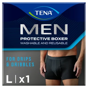 Produkt Tena Men Protective Boxer, wielorazowe bokserki na lekkie nietrzymanie moczu, czarne, rozmiar L, 1 sztuka do kupienia w Gemini. Wielorazowe bokserki chłonne w rozmiarze L marki Tena® Men Protective to wygodna, ...