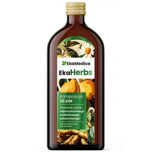 Produkt EkaMedica EkaHerbs, 500 ml do kupienia w Gemini. EkaHerbs EkaMedica to suplement diety w formie płynu, oparty na soku z pigwy (95,9%), wzbogacony o unikalną kompozycję 20 ziół inspirowaną tradycją zielarską. Preparat ...
