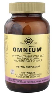 Omnium Kompleks Fitonurientów Wielofunkcyjnych Wegański Wegetariański Bez GMO Bez glutenu Skład Wielkość opakowania: 180 tabletek Porcja jednorazowa: 2 tabletkach Ilość porcji w opakowaniu: 90 Składniki 2 żelki RWS Witamina A (z naturalnego beta-karotenu) 2500 mcg 313% Witamina C (jako Ester-C®, askorbinian wapnia) 300 mg 375% Witamina D2 (jako ergokalcyferol) 5 mcg (200 IU) 100% Witamina E (jako bursztynian d-alfa tokoferylu) 60 mg 500% Witamina K (jako fitonadion) 20 mcg 27% Tiamina (jako monoazotan tiaminy) 30 mg 2727% Ryboflawina 35 mg 2500% Niacyna (jako niacynamid) 60 mg 375% Witamina B6 (jako chlorowodorek pirydoksyny) 10 mg 714% Folian (jako kwas foliowy) 666 mcg 400 mcg 100% Witamina B12 (jako cyjanokobalamina) 100 mcg 4000% Biotyna (jako D-biotyna) 100 mcg 200% Kwas pantotenowy (jako pantotenian D-Ca) 80 mg 1333% Cholina (jako dwuwinian choliny) 75 mg <> Wapń (jako chelat glicynianowy, askorbinian wapnia) 128 mg 16% Żelazo (jako chelat bisglicynian żelaza) 9 mg 64% Jod (jako jodek potasu) 150 mcg 100% Magnez (jako chelat glicynianowy, tlenek) 64 mg 17% Cynk (jako glicynian) 10 mg 100% Selen (jako L-selenometionina) 70 mcg 127% Miedź (jako chelat glicynianowy) 1,5 mg 150% Mangan (jako chelat glicynianowy) 2 mg 100% Chrom (jako pikolinian chromu) 100 mcg 250% Sód 10 mg <> Inozytol 75 mg <> Proszek z kiełków soi 50 mg <> Standaryzowany ekstrakt z kurkumy (kurkuminoidy 46,5 mg [93%]) (korzeń) 50 mg <> Brokuły w proszku 50 mg <> Kompleks Fosfatydyloseryny (fosfatydyloseryna 10 mg [20%)] 50 mg <> Polifenole (z ekstraktów z liści zielonej herbaty i pestek winogron) 20 mg <> Kompleks Bioflawonoidów Cytrusowych 13 mg <> Kwas alfa liponowy 10 mg <> Koenzym Q10 10 mg <> Kwercetyna 10 mg <> Ryboflawina-5'-fosforan 1 mg <> Karotenoid Mix (alfa i beta-karoten, luteina, zeaksantyna, kryptoksantyna) 13 mcg <> RWS - Dzienna referencyjna wartość spożycia <> Nie ustalono dziennej referencyjnej wartości spożycia Składniki: Witamina A (z naturalnego beta-karotenu); Witamina C (jako Ester-C®, askorbinian wapnia); Witamina D (jako D2, ergokalcyferol); Witamina E (jako bursztynian d-alfa tokoferylu); Witamina K (jako fitonadion); Tiamina (jako monoazotan tiaminy); Ryboflawina; Niacyna (jako niacynamid); Witamina B6 (jako chlorowodorek pirydoksyny; Folian (400 mcg kwasu foliowego); Witamina B12 (jako cyjanokobalamina); Biotyna (jako D-biotyna); Kwas pantotenowy (jako pantotenian D-Ca); Cholina (jako dwuwinian choliny); Wapń (jako chelat glicynianowy, askorbinian wapnia); Żelazo (jako chelat bisglicynian żelaza); Jod (jako jodek potasu); Magnez (jako chelat glicynianowy, tlenek); Cynk (jako glicynian); Selen (jako L-selenometionina); Miedź (jako chelat glicynianowy); Mangan (jako chelat glicynianowy); Chrom (jako pikolinian chromu); Sód; Inozyto; Proszek z kiełków soi; Standaryzowany ekstrakt z kurkumy (kurkuminoidy 46,5 mg [93%]) (korzeń); Brokuły w proszku; Kompleks Fosfatydyloseryny (fosfatydyloseryna 10 mg [20%)]; Polifenole (z ekstraktów z liści zielonej...