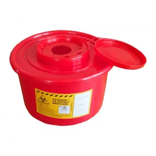 Pojemnik na odpady medyczne, wykonany z tworzywa sztucznego PE+PP, przeznaczony do gromaczenia i zniszczenia zużytych materiałów medycznych (waciki, igły, środki opatrunkowe, kompresy itp.).