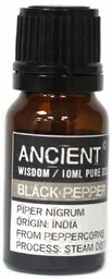 OLEJEK ETERYCZNY CZARNY PIEPRZ 100% NATURALNY Latin Name: Piper Nigrum Kraj pochodzenia: India Metoda otrzymywania: destylacja parą wodną. Olejek eteryczny z czarnego pieprzu jest olejkiem o wielu zastosowaniach i ma wiele zalet.