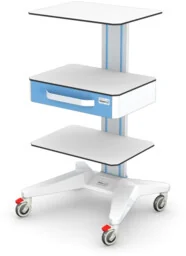 AP. 4A mobilny stolik-wózek na kółkach z 3 blatami pod aparaty medyczne i szufladą na akcesoria Mobilny stolik na kółkach pod aparaty medyczne lub aparaty do fizykoterapii oferuje trzy blaty wykonane z laminowanej płyty HPL oraz praktyczną szufladę na akcesoria i kable wykonaną ze stali lakierowanej proszkowo. Stelaż stolika wykonany jest z zamkniętego profilu aluminiowego lakierowanego proszkowo. Stolik wyposażony jest w uchwyt pomocny przy przetaczaniu stolika. Podstawa stalowa pokryta tworzywem ABS posiada 4 kółka kierunkowe (skrętne) o średnicy 75 mm z oponkami do twardych powierzchni, nadające stolikowi mobilności w obrębie gabinetu i placówki. 2 kółka posiadają blokadę jazdy (hamulec postojowy).