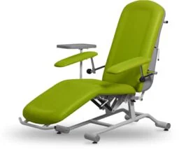 FoZa Dona fotel zabiegowy do badań pacjenta i zabiegów z oparciem rozkładanym do pozycji leżącej oraz regulowanym segmentem siedziska zintegrowanego z segmentem podudzi Fotel zabiegowy o uniwersalnych właściwościach do powszechnego zastosowania w gabinetach lekarskich do badania pacjentów (np. laryngologia, okulistyka) oraz w gabinetach i stacjach zabiegowych do dializ lub chemioterapii, a także do pobrań krwi w stacjach krwiodawstwa lub iniekcji i drobnych zabiegów w pozostałych placówkach medycznych. Fotel zabiegowy oparty jest na ramie z profili stalowych pokrytej lakierem proszkowym w kolorze szarym, odpornym na promieniowanie UV i uszkodzenia mechaniczne oraz środki do mycia i dezynfekcji. Wyposażony w bezszwowo tapicerowane siedzisko ze zintegrowanym segmentem podudzi i w oparcie pleców. Siedzisko i oparcie pleców regulowane są sprężynami gazowymi. Dzięki regulacjom oparcia i segmentu podudzi pacjent może przyjąć nie tylko pozycję siedzącą, ale również pozycję półleżącą, leżącą i półsiedzącą.