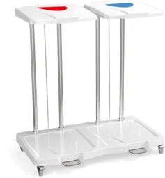 MB. 2C podwójny wózek koszowy na odpady medyczne lub brudną bieliznę z uchwytami na worki o pojemności 60-80 litrów i pokrywami ABS otwieranymi przyciskami nożnymi Podwójny wózek koszowy na odpady medyczne lub brudną bieliznę z uchylnymi pokrywami worków ze spowalniaczami cichego opadania oraz uchwytami i zaczepami na dwa worki foliowe o pojemności 60-80 litrów. Wózek posiada stelaż wykonany ze stali kwasoodpornej w gatunku 0H18N9 (rurki) oraz pokrywy worków wykonane z tworzywa sztucznego ABS w kolorze białym lub szarym. Pokrywy oznaczone różnymi kolorami do segregacji odpadów. Zaczepy w obręczy uchwytu każdego worka zabezpieczają go przez opadnięciem lub zsunięciem się z uchwytu, także w czasie przetaczania wózka. Podstawa wózka koszowego wykonana jest ze stali ocynkowanej z jednolitą górną osłoną z tworzywa ABS w kolorze białym lub szarym, i wyposażona jest w 4 koła kierunkowe (skrętne) o średnicy 50 mm w obudowie ze stali ocynkowanej.