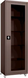 MD/1k. 8017 mobilna szafa lekarska 1-skrzydłowa 1-komorowa w kolorze brązowym RAL 8017 na kołach z przeszklonymi drzwiami Szafa lekarska 1-skrzydłowa wykonana z czarnej blachy stalowej lakierowanej proszkowo na kolor RAL 8017 (brązowy czekoladowy). 1-komorowy korpus szafy posiada od frontu stalowe drzwi w typie witryny z przeszkleniami wykonanymi z bezpiecznego szkła hartowanego. Drzwi osadzone są na zawiasach kołkowych i posiadają 3-punktowe ryglowanie zwalniane typowym dla wysokich frontów mebli zamkiem baskwilowym (bębenkowy, patentowy) z obracanym uchwytem klamkowym. Standardowym wyposażeniem szafy lekarskiej są 4 półki, których położenie można regulować w pionie przenosząc półkę na kolejne wsporniki umieszczone w narożnikach szafy. Półki wykonane są z bezpiecznego szkła hartowanego.