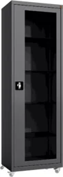 MD/1k. 9005 mobilna szafa lekarska 1-skrzydłowa 1-komorowa w kolorze czarnym RAL 9005 na kołach z przeszklonymi drzwiami Szafa lekarska 1-skrzydłowa wykonana z czarnej blachy stalowej lakierowanej proszkowo na kolor RAL 9005 (czarny głęboki). 1-komorowy korpus szafy posiada od frontu stalowe drzwi w typie witryny z przeszkleniami wykonanymi z bezpiecznego szkła hartowanego. Drzwi osadzone są na zawiasach kołkowych i posiadają 3-punktowe ryglowanie zwalniane typowym dla wysokich frontów mebli zamkiem baskwilowym (bębenkowy, patentowy) z obracanym uchwytem klamkowym. Standardowym wyposażeniem szafy lekarskiej są 4 półki, których położenie można regulować w pionie przenosząc półkę na kolejne wsporniki umieszczone w narożnikach szafy. Półki wykonane są z bezpiecznego szkła hartowanego.