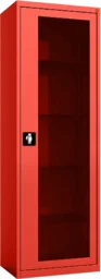 MD/1s. 3020 wolnostojąca szafa lekarska 1-skrzydłowa 1-komorowa w kolorze czerwonym RAL 3020 z przeszklonymi drzwiami Wolnostojąca szafa lekarska 1-skrzydłowa wykonana z czarnej blachy stalowej lakierowanej proszkowo na kolor RAL 3020 (czerwony). 1-komorowy korpus szafy posiada od frontu stalowe drzwi w typie witryny z przeszkleniem wykonanym z bezpiecznego szkła hartowanego. Drzwi osadzone są na zawiasach kołkowych i posiadają 3-punktowe ryglowanie zwalniane typowym dla wysokich frontów mebli zamkiem baskwilowym (bębenkowy, patentowy) z obracanym uchwytem klamkowym. Standardowym wyposażeniem szafy lekarskiej są 4 półki, których położenie można regulować w pionie przenosząc półkę na kolejne wsporniki umieszczone w narożnikach szafy. Półki wykonane są z bezpiecznego szkła hartowanego.