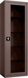 MD/1s. 8017 wolnostojąca szafa lekarska 1-skrzydłowa 1-komorowa w kolorze brązowym RAL 8017 z przeszklonymi drzwiami Wolnostojąca szafa lekarska 1-skrzydłowa wykonana z czarnej blachy stalowej lakierowanej proszkowo na kolor RAL 8017 (brązowy czekoladowy). 1-komorowy korpus szafy posiada od frontu stalowe drzwi w typie witryny z przeszkleniem wykonanym z bezpiecznego szkła hartowanego. Drzwi osadzone są na zawiasach kołkowych i posiadają 3-punktowe ryglowanie zwalniane typowym dla wysokich frontów mebli zamkiem baskwilowym (bębenkowy, patentowy) z obracanym uchwytem klamkowym. Standardowym wyposażeniem szafy lekarskiej są 4 półki, których położenie można regulować w pionie przenosząc półkę na kolejne wsporniki umieszczone w narożnikach szafy. Półki wykonane są z bezpiecznego szkła hartowanego.