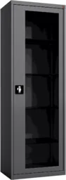 MD/1s. 9005 wolnostojąca szafa lekarska 1-skrzydłowa 1-komorowa w kolorze czarnym RAL 9005 z przeszklonymi drzwiami Wolnostojąca szafa lekarska 1-skrzydłowa wykonana z czarnej blachy stalowej lakierowanej proszkowo na kolor RAL 9005 (czarny głęboki). 1-komorowy korpus szafy posiada od frontu stalowe drzwi w typie witryny z przeszkleniem wykonanym z bezpiecznego szkła hartowanego. Drzwi osadzone są na zawiasach kołkowych i posiadają 3-punktowe ryglowanie zwalniane typowym dla wysokich frontów mebli zamkiem baskwilowym (bębenkowy, patentowy) z obracanym uchwytem klamkowym. Standardowym wyposażeniem szafy lekarskiej są 4 półki, których położenie można regulować w pionie przenosząc półkę na kolejne wsporniki umieszczone w narożnikach szafy. Półki wykonane są z bezpiecznego szkła hartowanego.