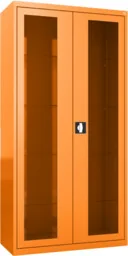 MD/2s. 2011 wolnostojąca szafa lekarska 2-skrzydłowa 1-komorowa w kolorze pomarańczowym RAL 2011 z przeszklonymi skrzydłami drzwi Wolnostojąca szafa lekarska 2-skrzydłowa wykonana z czarnej blachy stalowej lakierowanej proszkowo na kolor RAL 2011 (pomarańczowy głęboki). 1-komorowy korpus szafy posiada od frontu 2 stalowe skrzydła drzwi w typie witryny z przeszkleniami wykonanymi z bezpiecznego szkła hartowanego. Oba skrzydła drzwi osadzone są na zawiasach kołkowych, a każde z nich posiada 3-punktowe ryglowanie. Ryglowanie zwalniane jest typowym dla wysokich frontów mebli jednym zamkiem baskwilowym (bębenkowy, patentowy) z obracanym uchwytem klamkowym Standardowym wyposażeniem szafy lekarskiej są 4 półki, których położenie można regulować w pionie przenosząc półkę na kolejne wsporniki umieszczone w narożnikach szafy. Półki wykonane są z bezpiecznego szkła hartowanego.