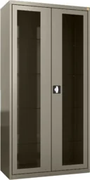 MD/2s. 7032 wolnostojąca szafa lekarska 2-skrzydłowa 1-komorowa w kolorze szarym RAL 7032 z przeszklonymi skrzydłami drzwi Wolnostojąca szafa lekarska 2-skrzydłowa wykonana z czarnej blachy stalowej lakierowanej proszkowo na kolor RAL 7032 (szary kamienisty). 1-komorowy korpus szafy posiada od frontu 2 stalowe skrzydła drzwi w typie witryny z przeszkleniami wykonanymi z bezpiecznego szkła hartowanego. Oba skrzydła drzwi osadzone są na zawiasach kołkowych, a każde z nich posiada 3-punktowe ryglowanie. Ryglowanie zwalniane jest typowym dla wysokich frontów mebli jednym zamkiem baskwilowym (bębenkowy, patentowy) z obracanym uchwytem klamkowym Standardowym wyposażeniem szafy lekarskiej są 4 półki, których położenie można regulować w pionie przenosząc półkę na kolejne wsporniki umieszczone w narożnikach szafy. Półki wykonane są z bezpiecznego szkła hartowanego.